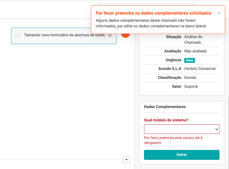 Quando o agente de suporte visualizar o chamado, o sistema irá exibir o aviso, caso o dado complementar não esteja preenchido: