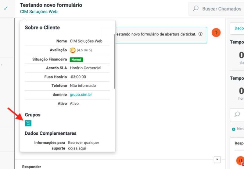 Outro recurso adicionado nessa atualização, foi o atalho para relacionar o cliente em grupos. No chamado, ao clicar sobre o nome do cliente, para visualizar as informações, foi adicionado o campo Grupos com o botão editar: