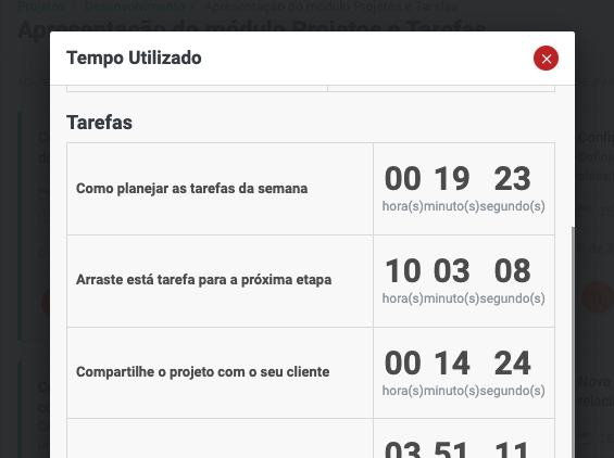 Além de exibir o tempo total do projeto, por etapa e usuário, foi adicionado também a opção por tarefa.