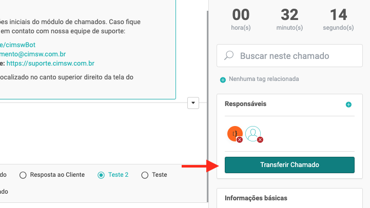 - Somente o responsável pelo chamado ou o usuário com permissões poderão transferir o chamado de setor e responsável.