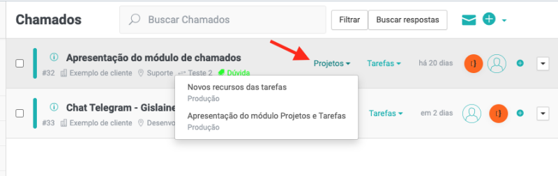Quando o chamado tem um ou mais projetos / tarefas relacionadas, elas serão exibidas na lista de chamados: