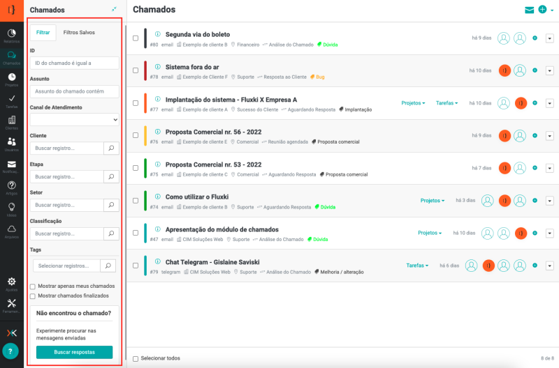 Atenção: Os filtros disponíveis no Fluxki respeitam as permissões do usuário. Caso o seu usuário não esteja relacionado no setor do chamado, ele não será exibido como resultado na busca.