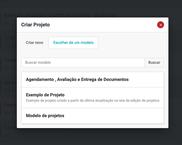 O formulário de cadastro do projeto foi melhorado. Agora a opção Criar novo e Escolher de um modelo foi separado em abas, ficando mais fácil o cadastro do projeto: