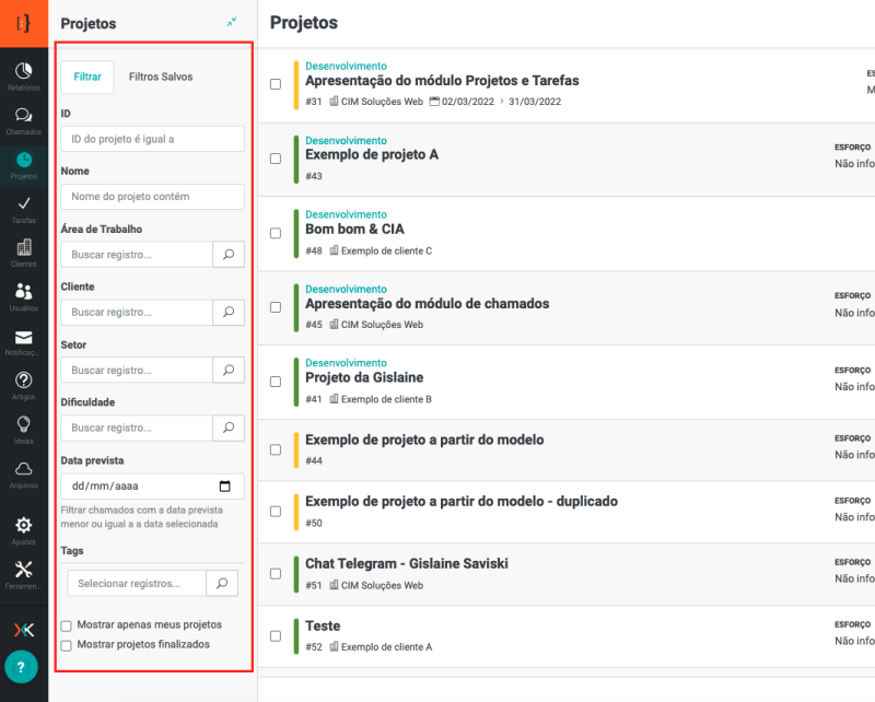 Melhoria na busca dos projetos, agora o filtro fica visível facilitando a busca dos projetos:
