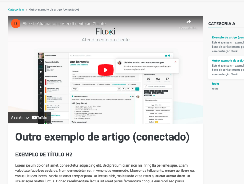 Caso a URL do vídeo (YouTube ou Vimeo) seja informada no cadastro do artigo, ele será exibido na base de conhecimento, antes de conteúdo do artigo: