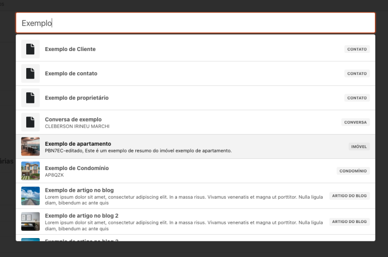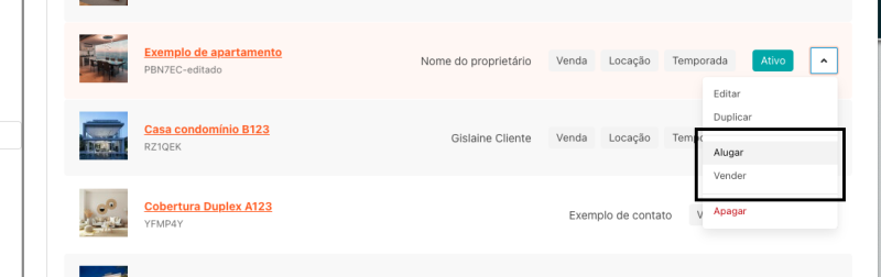 Na lista de imóveis, clique na seta (ao lado de Ativo / Inativo) para acessar o atalho: